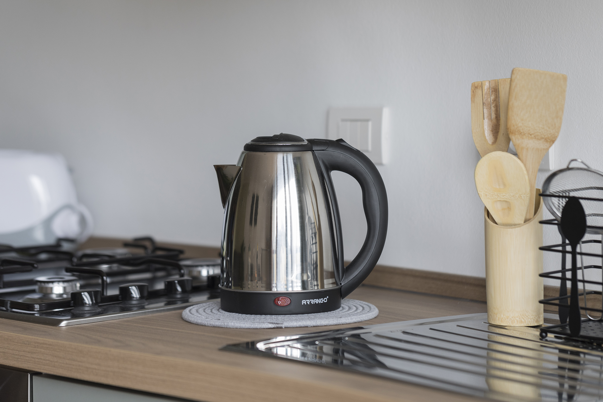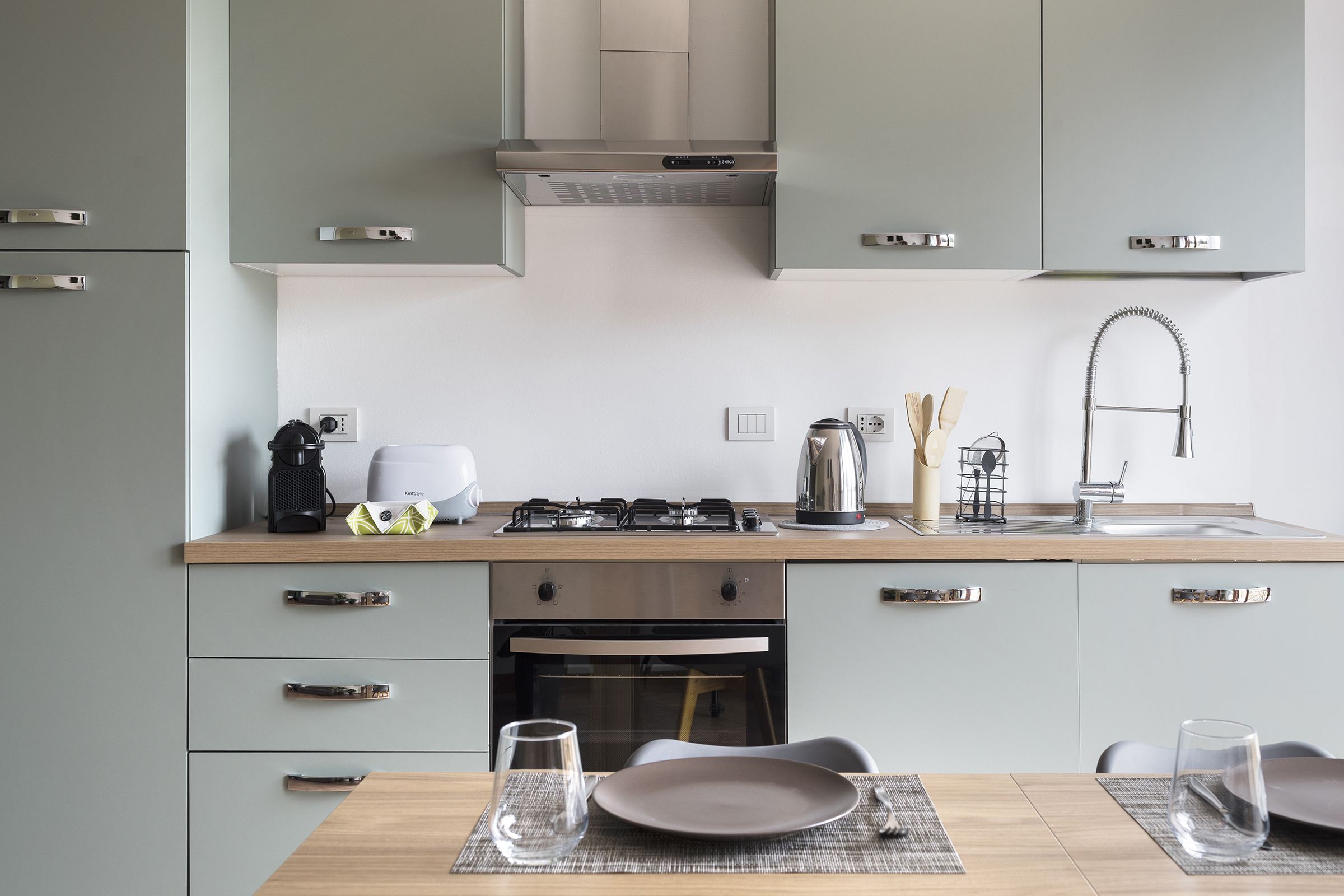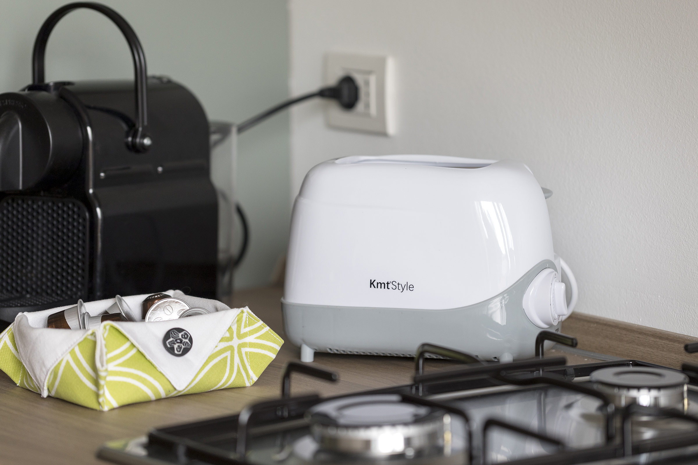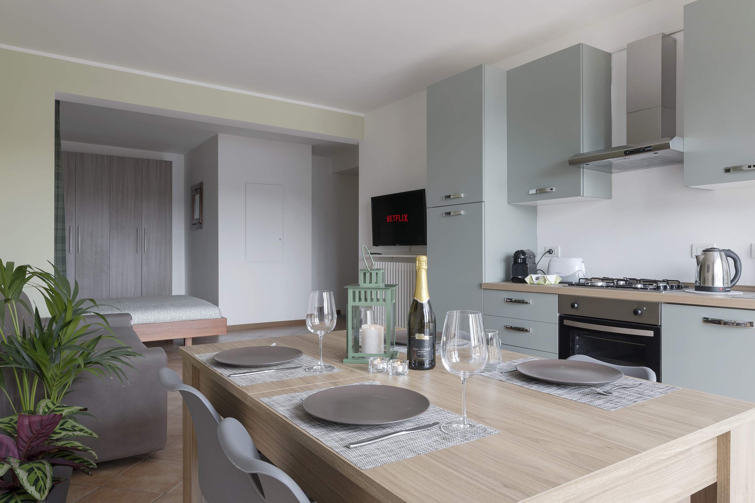 The spacious living area is perfectly furnished for your comfort. The modern kitchen has high-quality appliances, including an oven, stove top, coffee machine, kettle and microwave. The dining table is nicely set, perfect for romantic dinners or family meals. The lounge area, equipped with a comfortable sofa bed, is ideal for relaxing while watching a Netflix movie.