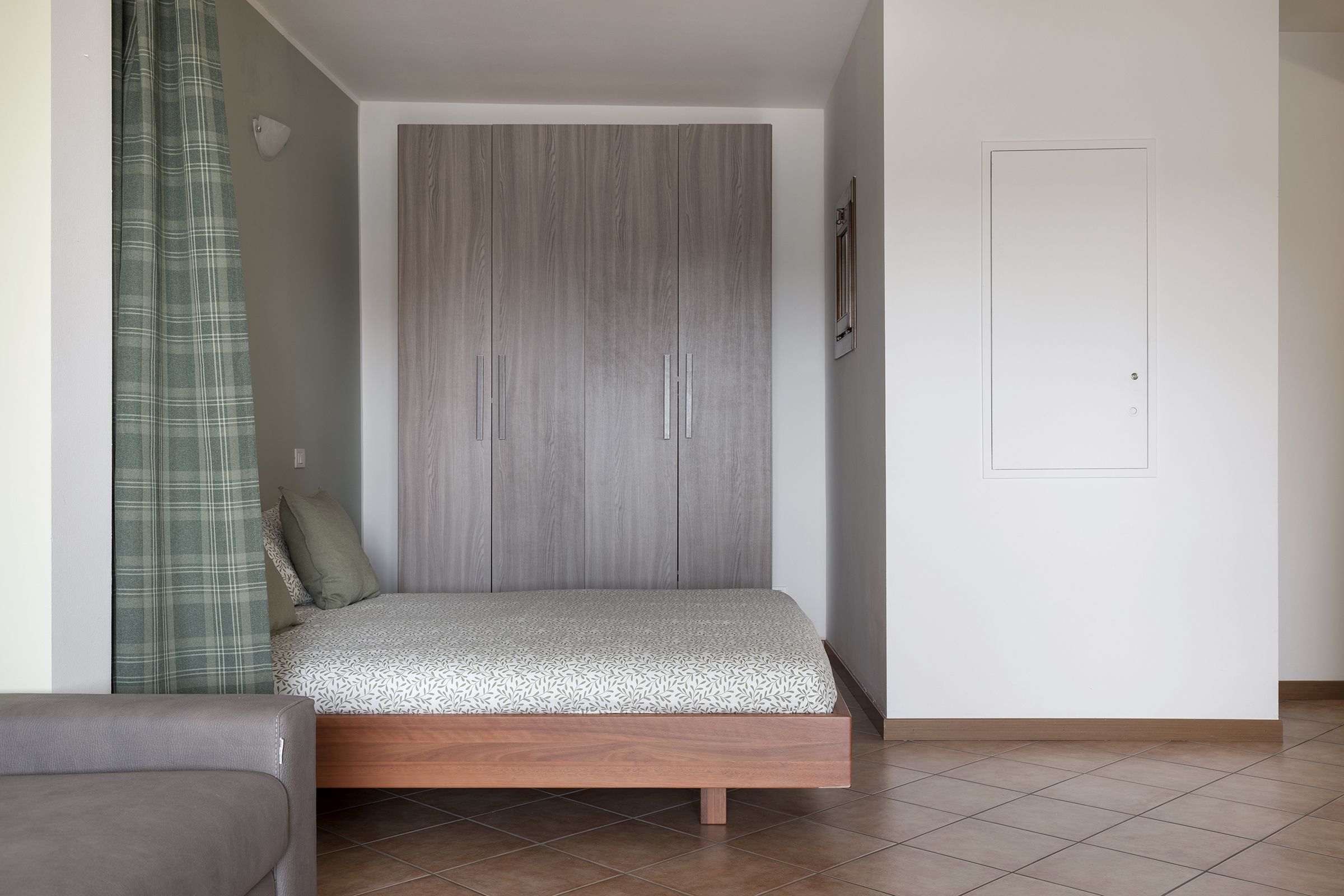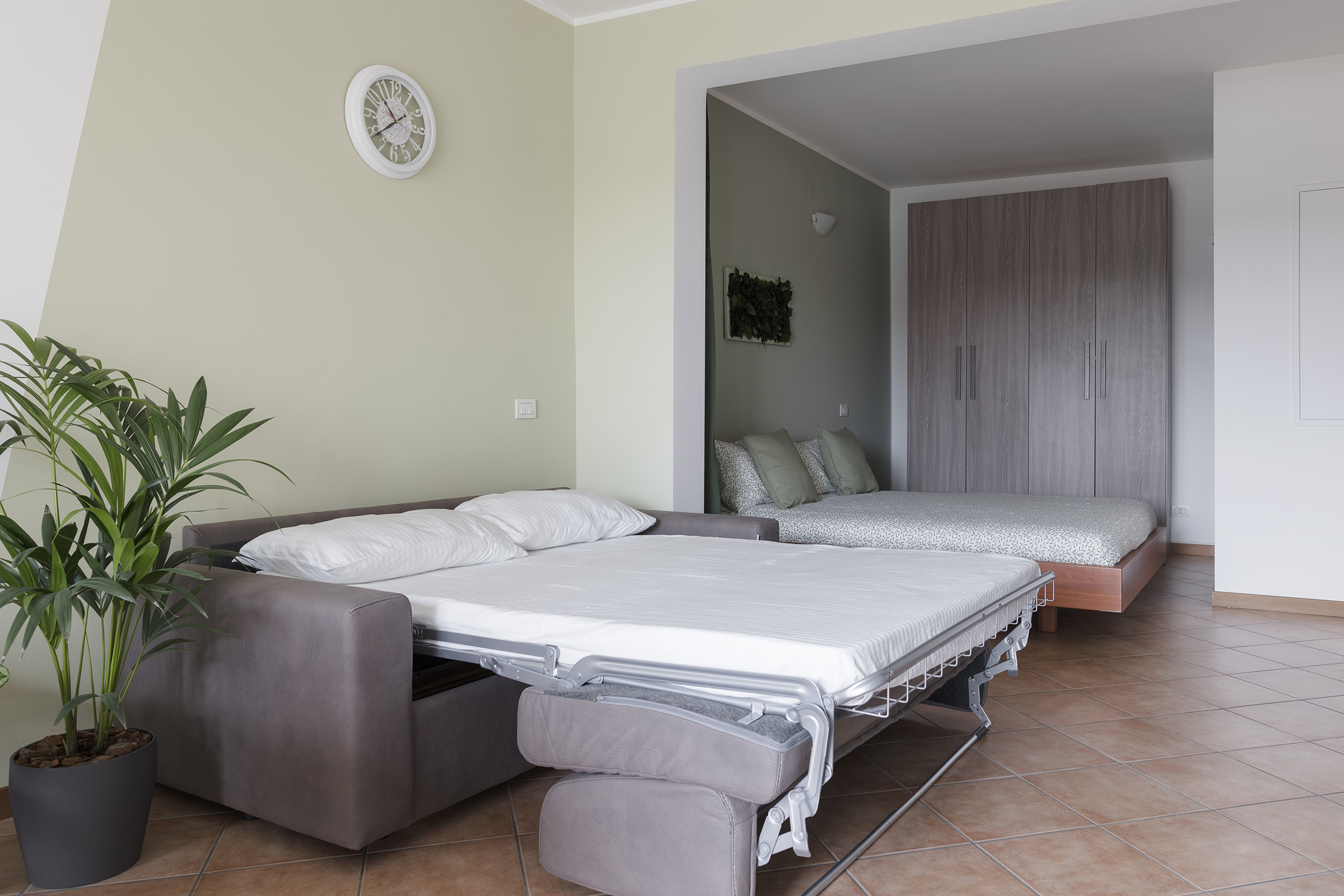 The sleeping area, separated by an elegant curtain, offers a double bed with high-quality bed linen, ensuring a restful sleep. The spacious wardrobe allows you to organize your personal belongings conveniently.